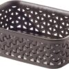 Panier de rangement en plastique avec aspect tricot, conçu pour organiser facilement les objets du quotidien. Il convient au salon, à la chambre, à la salle de bain ou au bureau pour garder accessoires, linge ou fournitures bien rangés. Capacité de 19 L, dimensions 39,6 x 28,8 x 23,6 cm.
