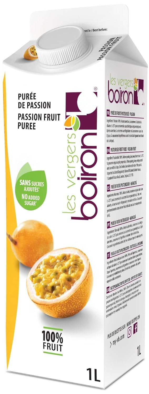 Purée de fruit de la passion composée à 100 % de fruits, sans sucre ajouté, sans arômes, sans colorants ni conservateurs. Elle convient pour préparer des cocktails, des desserts, des pâtisseries ou des glaces. Format 1 litre.