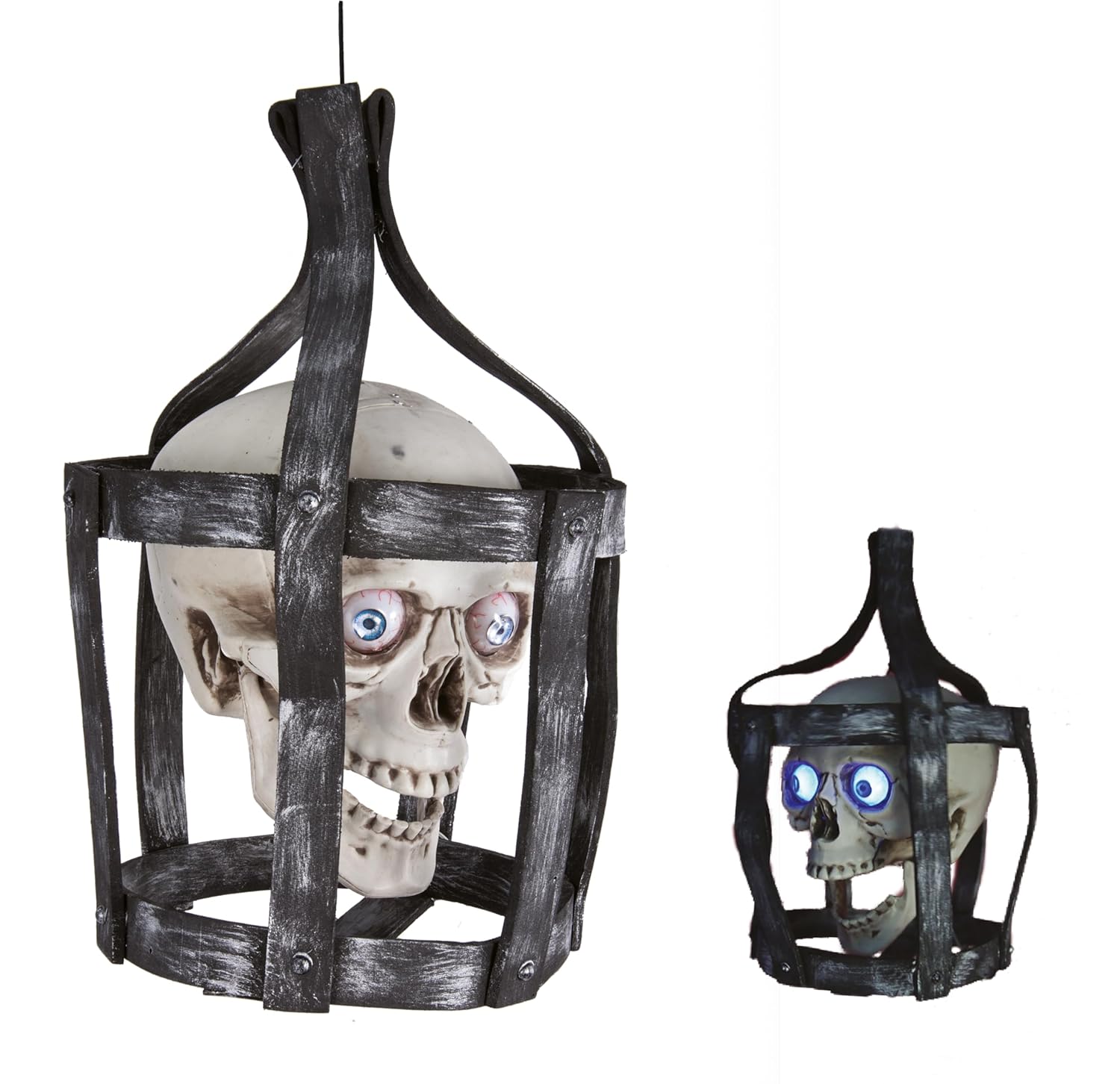 Décoration d’Halloween animée et sonore représentant une tête de mort en cage. Idéale pour créer une ambiance effrayante lors d’une soirée, dans une maison hantée ou en décoration saisonnière. Format 45 cm.