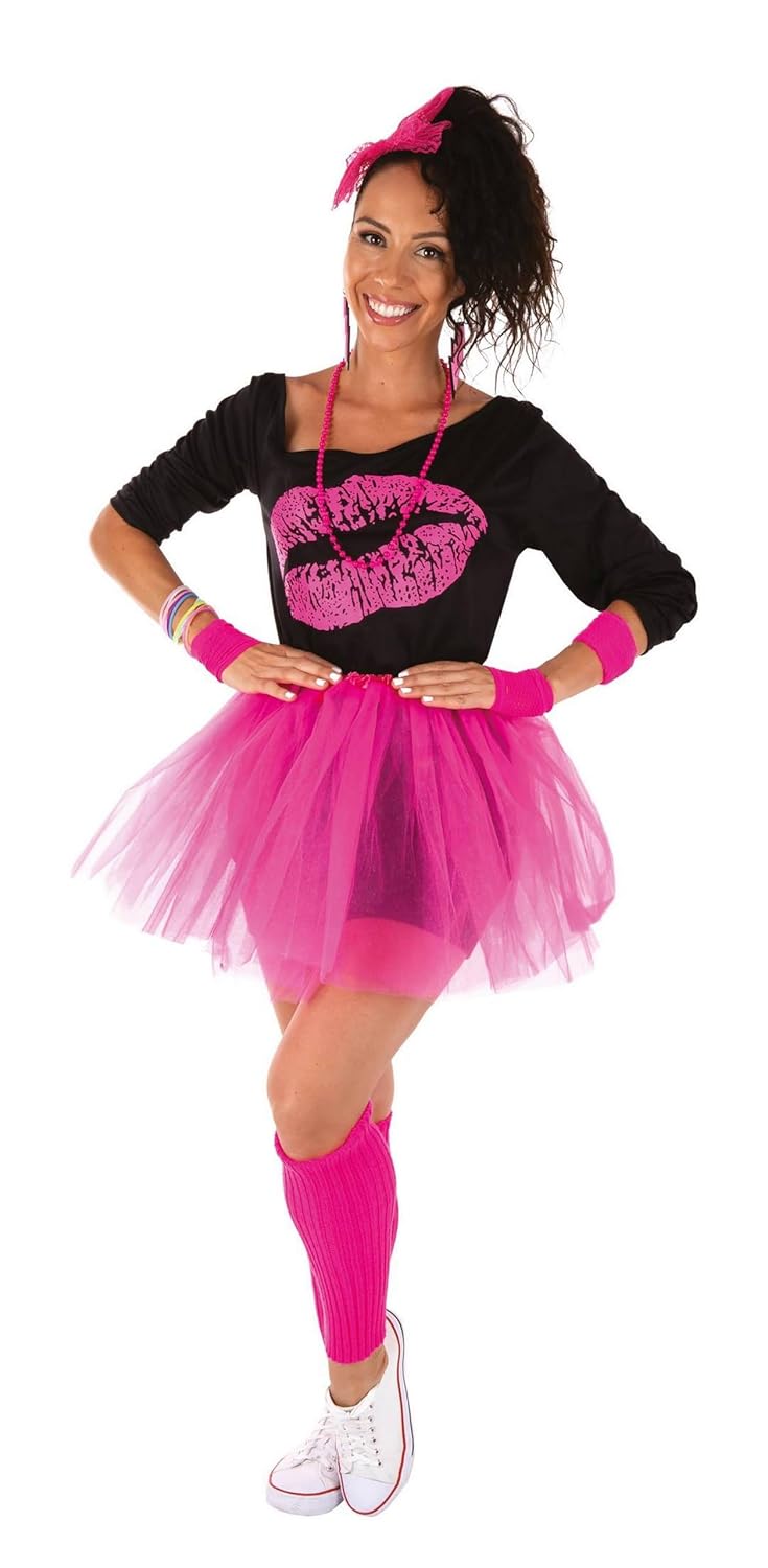 Set de déguisement au style rétro comprenant un tutu rose fluo pour une tenue inspirée des années 80. Il convient pour le carnaval, les fêtes costumées et les évènements à thème. Taille unique.