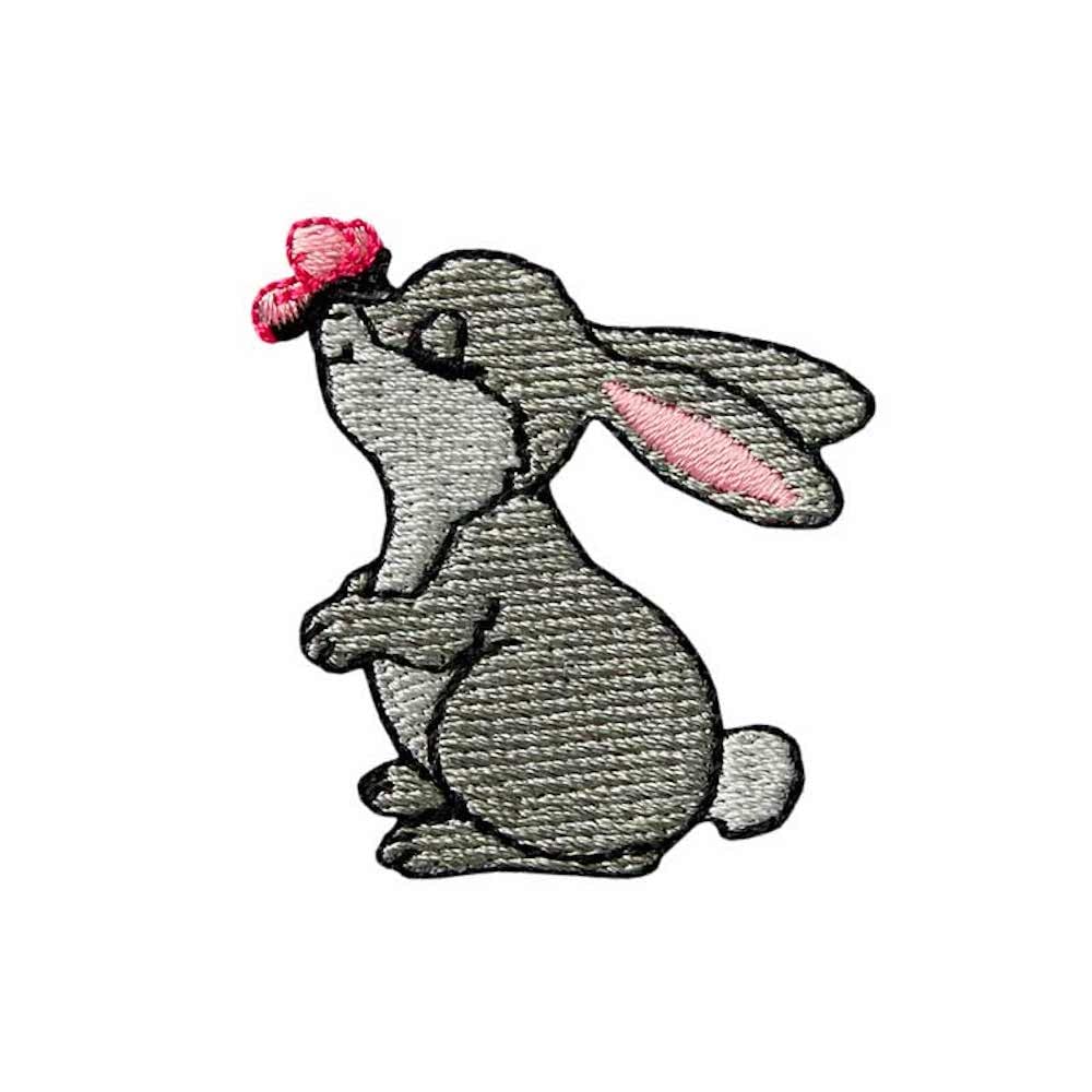 Écusson thermocollant avec motif lapin et papillon, conçu pour être appliqué sur un vêtement ou un accessoire textile. Il convient pour personnaliser, décorer ou masquer une petite usure sur différents tissus. Format : 4 x 4 cm.