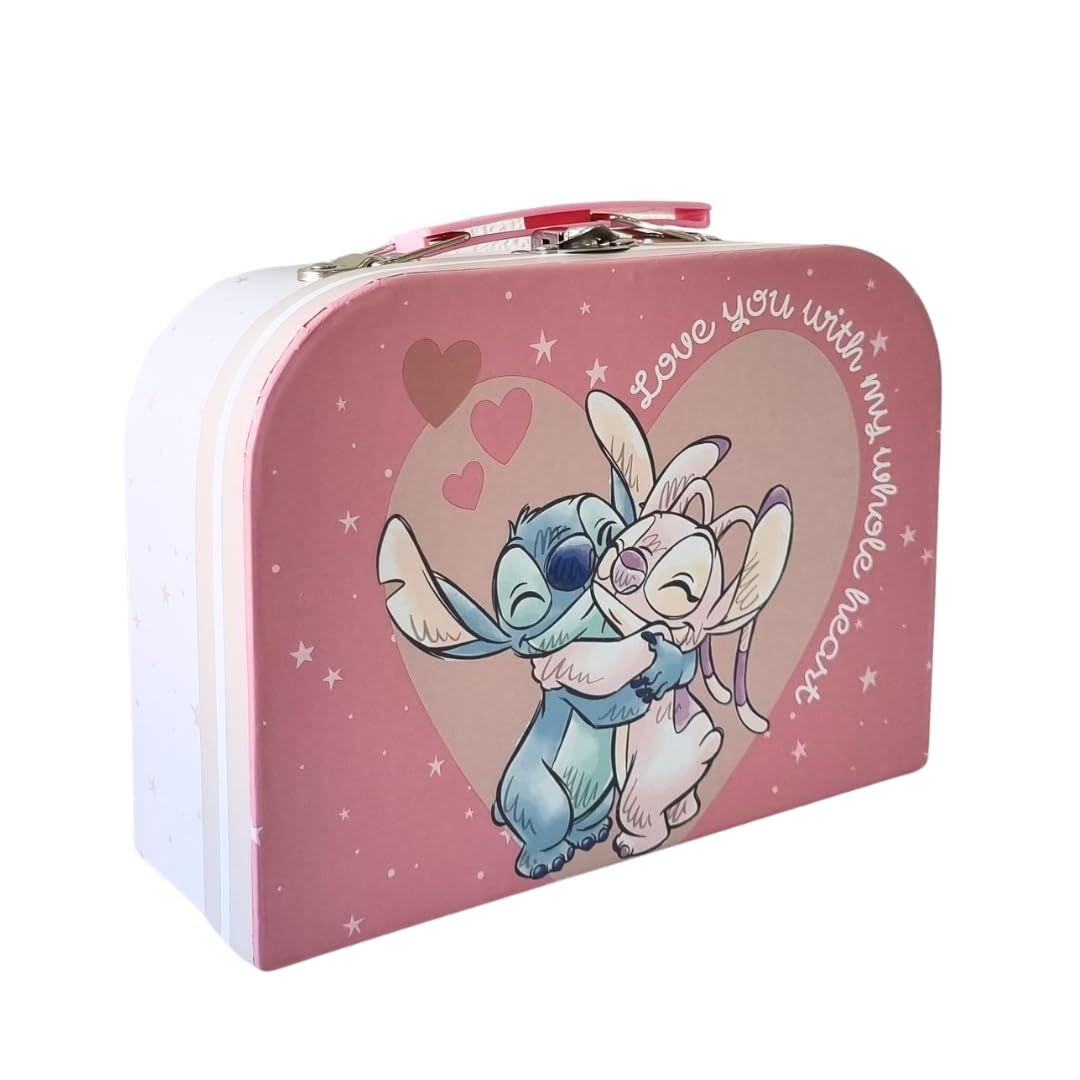 Valisette de rangement en carton avec poignée, décorée sur le thème de Stitch. Elle convient aux enfants pour ranger et transporter facilement de petits jouets, crayons, feutres ou peintures. Format compact : 9,5 x 7 x 15 cm.
