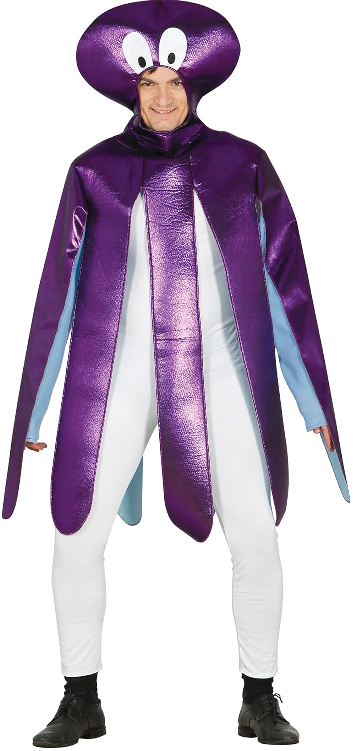 Ce déguisement de poulpe pour adulte comprend une tunique avec tentacules et une cagoule, en taille 42-44 (L). Il convient pour le carnaval, une soirée déguisée ou une fête de célibataire, avec un look original et facile à reconnaître. Le pantalon et les chaussures ne sont pas inclus.