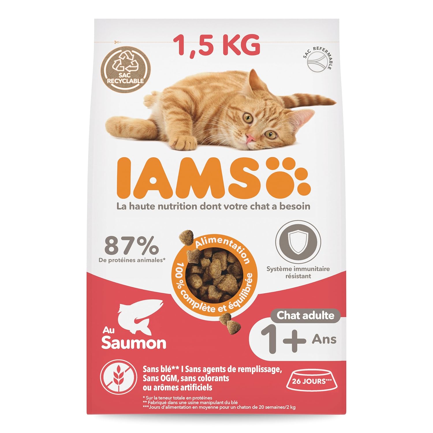 Ces croquettes pour chats adultes au saumon constituent une alimentation 100 % complète et équilibrée. Elles conviennent aux propriétaires recherchant un repas quotidien pour chat adulte, avec une formulation sans OGM, colorants ni arômes artificiels. Le sac refermable de 1,5 kg facilite la conservation.