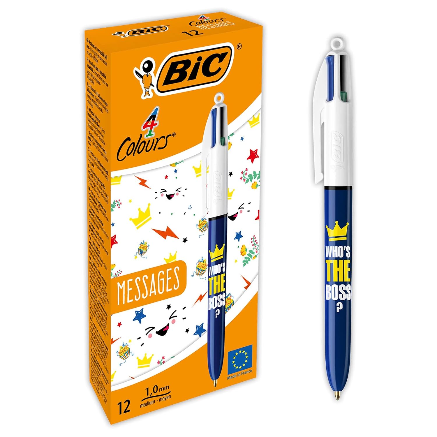 BIC 4 Couleurs Messages Stylos-Bille Pointe Moyenne (1,0 mm) – Motif « Who’s The Boss », Boîte de 12