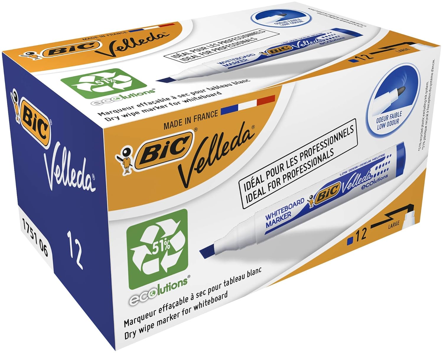 BIC Velleda 1751 ECOlutions Feutres pour Tableau Blanc Effaçables à Sec à Pointe Moyenne Biseautée – Bleu , Boîte de 12