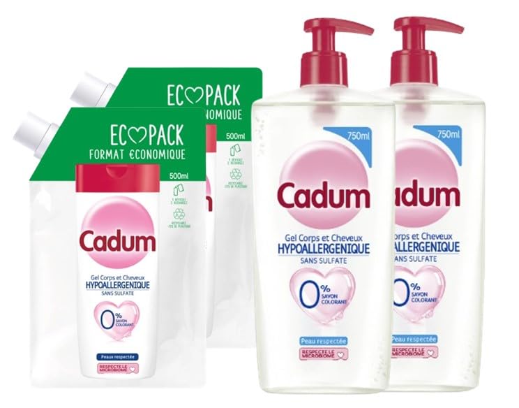CADUM – Lot de 4 gels douche, 2 Hypoallergénique 750ml + 2 éco recharges Hypoallergénique sans sulfate 500ml