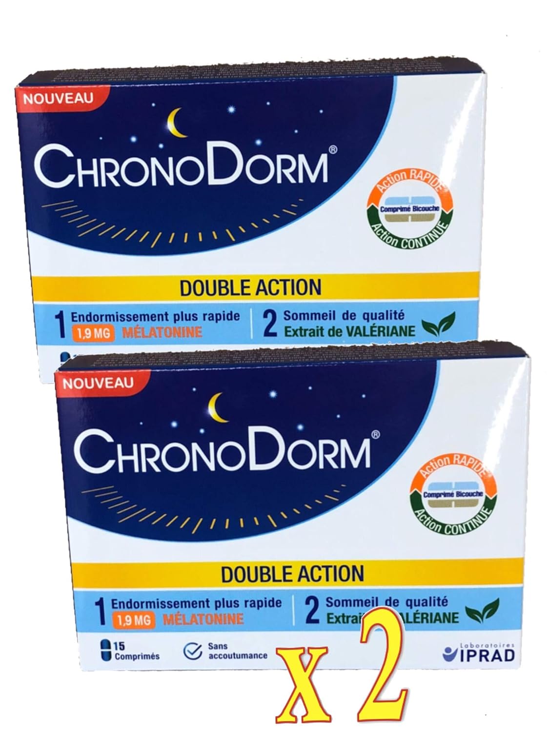CHRONODORM – Mélatonine et PLANTES Double-Action 1.9 mg (15 cp) Phytothérapie et mélatonine pour favoriser l’endormissement – Lot de 2 Boites de 15 Comprimés (2)