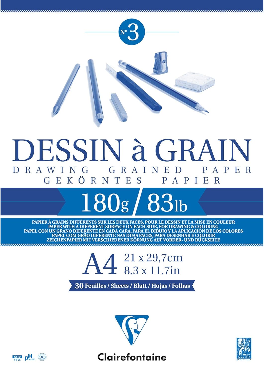 Clairefontaine 96624C Bloc Encollé Papier Dessin à Grain – 30 Feuilles Papier Dessin au Grain Marqué – A4 21×29,7 cm 180g – Idéal pour le Dessin et Croquis au Crayon, Feutre et Fusain