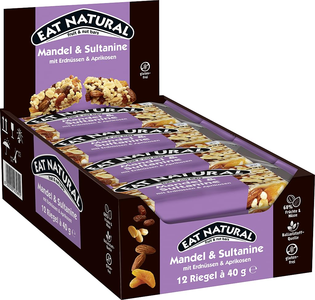EAT NATURAL – Barres sans gluten – Amandes, raisins secs, abricots & cacahuètes – 12 barres de 40g
