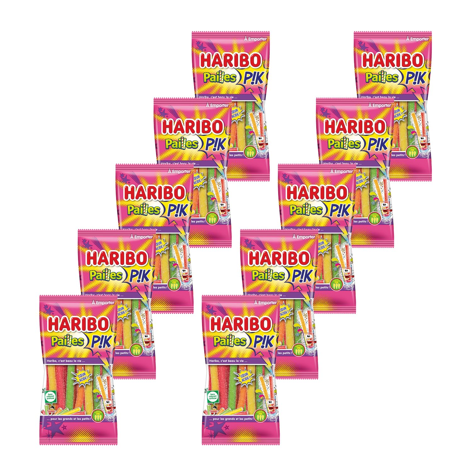 HARIBO – Paille PIK – Bonbons Piquants – Goûts Tropical/Passion, Fraise/Citron, Iced Tea Pêche & Cola – Sans Colorants Artificiels – 10 x 90 g