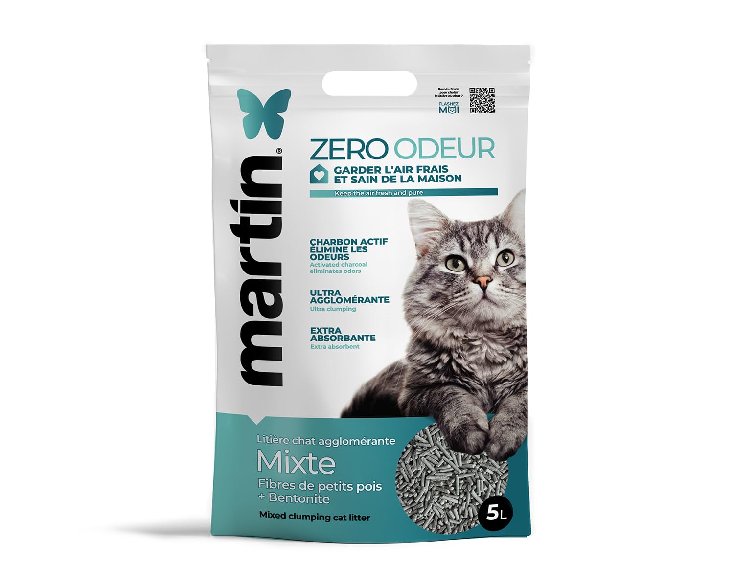 Litière Agglomérante Naturelle Chat Martin Zero Odeur 5 L – 4 Sacs de 5L – Charbon Actif & Bentonite – Anti-Odeurs, Ultra Absorbante, sans Poussière, Maison Fraîche et Saine