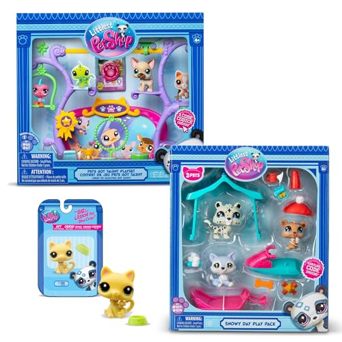 Littlest Pet Shop – Pack Exclusif 2 Coffrets : Jour de Neige & Pets Got Talent (5 Figurines et 14 Accessoires) + 1 Figurine Supplémentaire (Petit Chat Jaune) – Licence Officielle – Mini Figurines – Jo