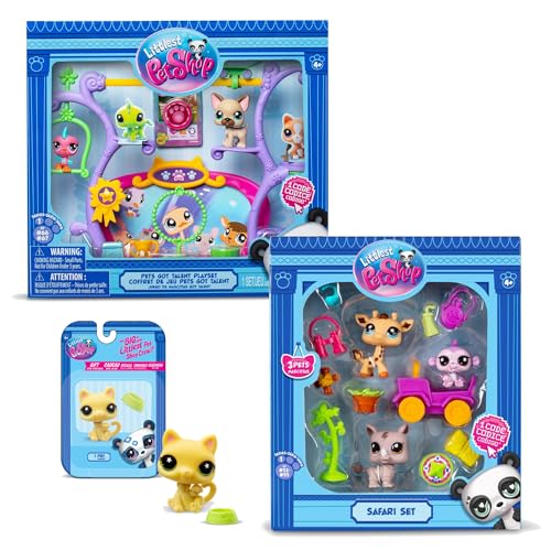 Littlest Pet Shop – Pack Exclusif 2 Coffrets : Safari & Pets Got Talent (5 Figurines et 14 Accessoires) + 1 Figurine Supplémentaire (Petit Chat Jaune) – Licence Officielle – Mini Figurines – Jouet Enf