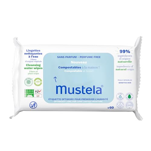 Mustela Lingettes à langer compostables sans parfum, 100% fibres végétales Lyocell, corps et maquillage, bébé et famille – 99.7% d’ingrédients d’origine naturelle (60 Pcs)
