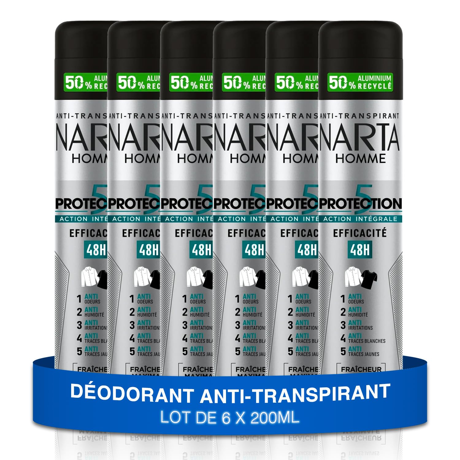 NARTA – Déodorant Homme – Protection 5 Anti-Transpirant Spray Efficacité 48h Fraîcheur Maximale Sans Alcool – lot de 6x200ml
