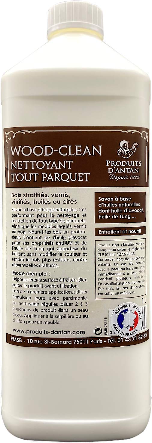 Nettoyant parquets Woodclean Produits D’Antan – Pour bois stratifiés, vernis, vitrifiés, huilés ou cirés – Nettoie,nourrit en profondeur et protège les bois – 1L
