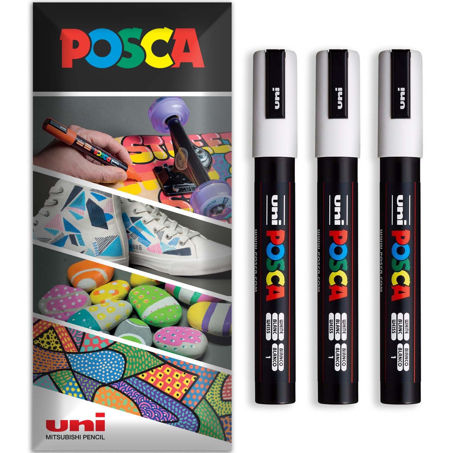 Posca Marqueur permanent à base d’eau – Utilisation multi-surfaces – PC-5M – Lot de 3 stylos dans un étui (blanc)
