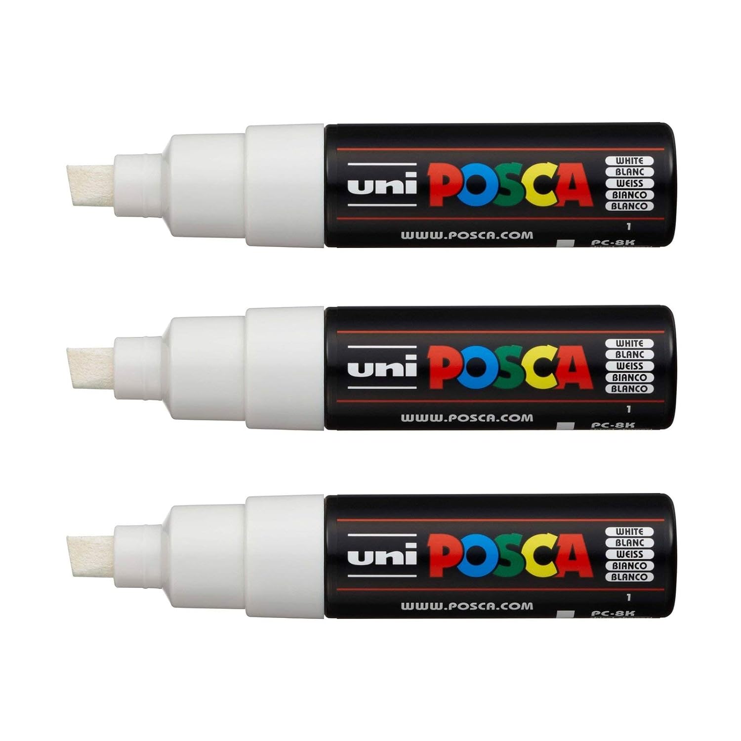 POSCA – Uni Mitsubishi Pencil – 3 Marqueurs Blanc PC8K – Pointe Biseautée Pointe Large 8 mm – Marqueur Peinture À Base d’Eau – Tout Support – Pour Papier, Textile, Verre, Galet