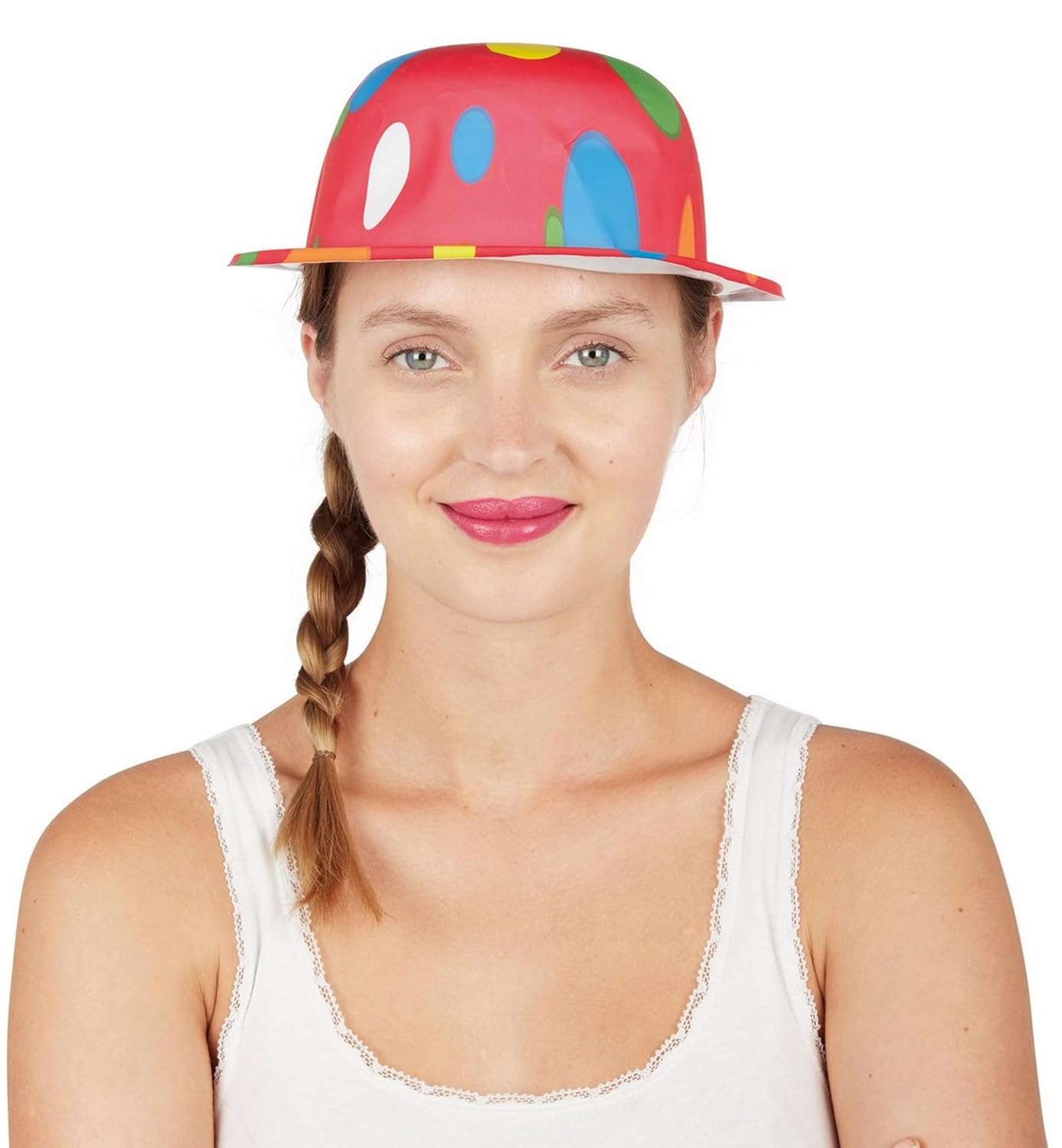 P’TIT CLOWN – 13003 – Chapeau Melon Rouge à Pois Multicolores – Adulte, Unisexe – Accessoire Déguisement Carnaval, Cosplay, Fête Costumée, Spectacle – Plastique