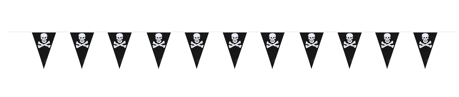P’TIT CLOWN – 23811 – Guirlande Fanions Pirate – Drapeau Pirate Rectangulaire – Pour Décoration de Fête Anniversaire, Carnaval, Halloween, Fête à Thème – Polyester – 10m – Noir