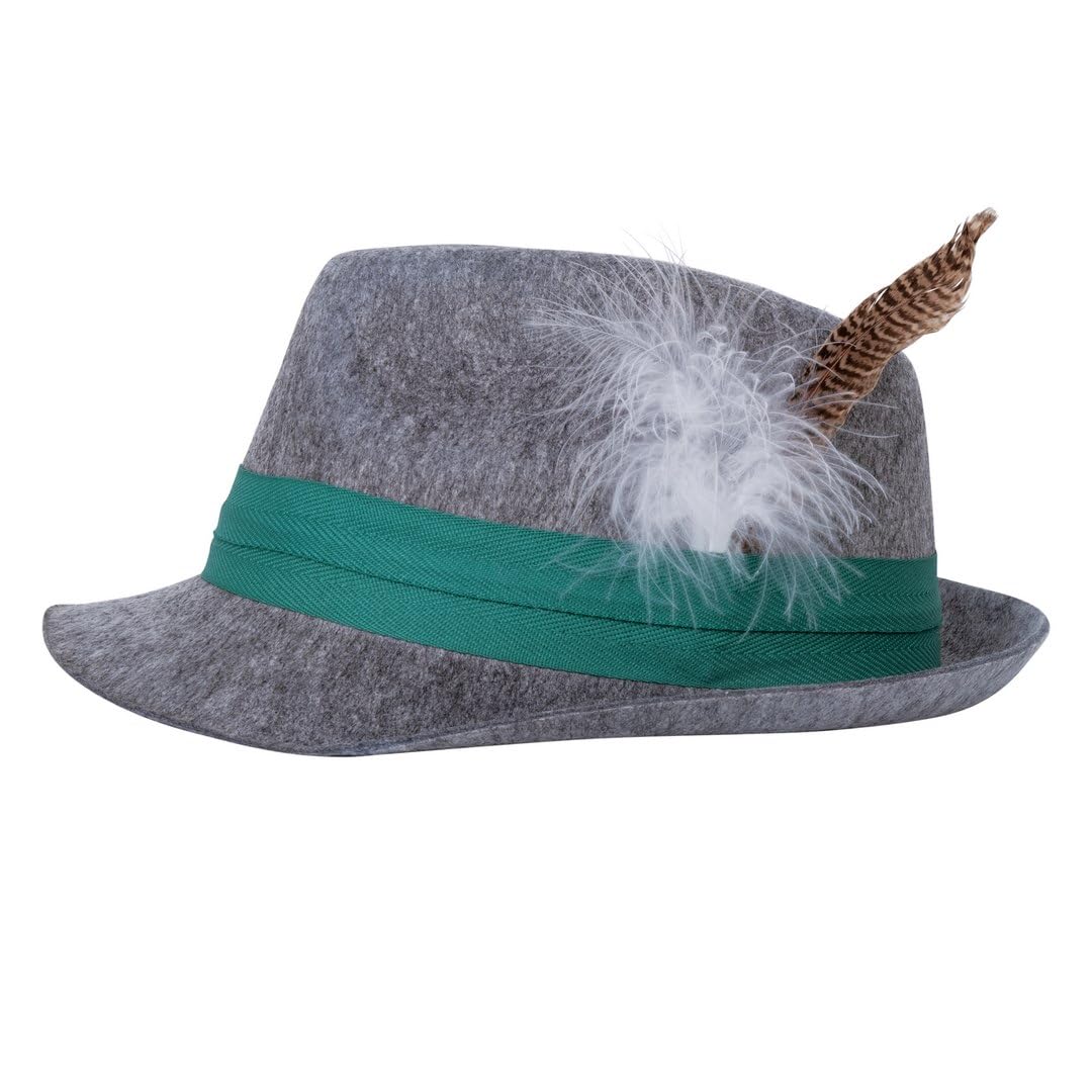 P’TIT CLOWN – 23845 – Chapeau Bavarois Adulte – Borsalino avec Ruban et Plumes – Chapeau Tyrolien – Accessoire Costume Oktoberfest, Fête de la Bière, Carnaval – Gris