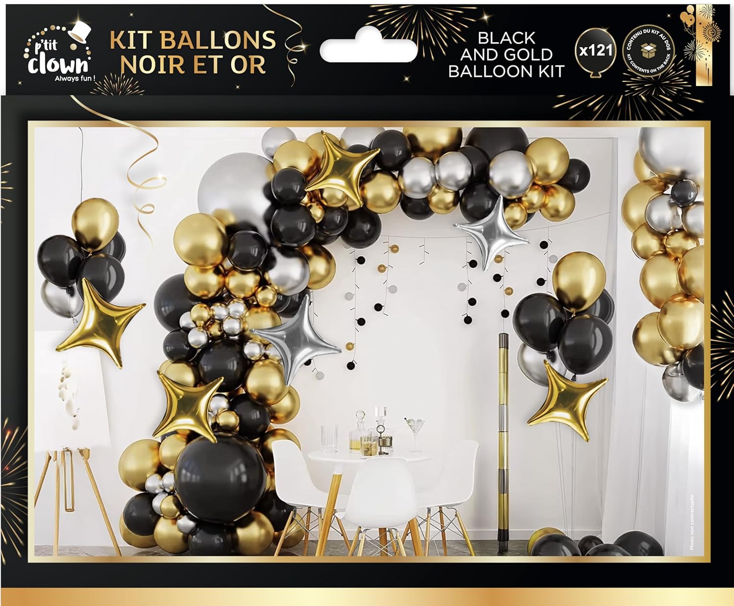 P’TIT CLOWN – 24365 – Kit Ballons Noir et Or 115 Pièces – Décoration Fête, Anniversaire, Nouvel An, Réveillon, Soirée à Thème, Arche Ballons Festive