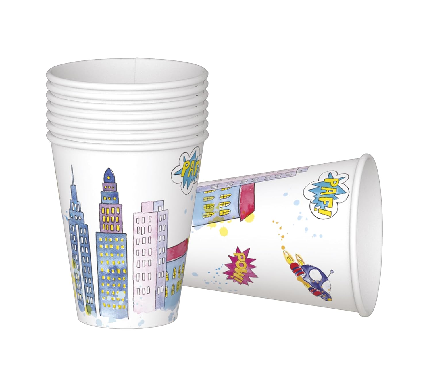 P’tit Clown CAM ET LEON – Accessoires Décoration d’Anniversaire Enfant – Thème Super Héros – Assiettes, Gobelets, Serviettes, Confettis, Sachets, Cartes d’Invitation (Gobelet x8)