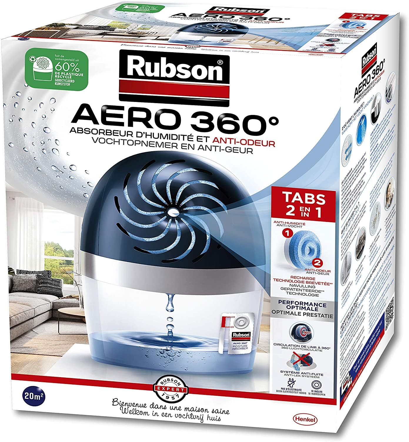 Rubson – Absorbeur d’Humidité Aero 360 pour pièces de 20 m² – Déshumidificateur d’air anti odeurs et anti moisissure – 1 recharge neutre de 450 g incluse