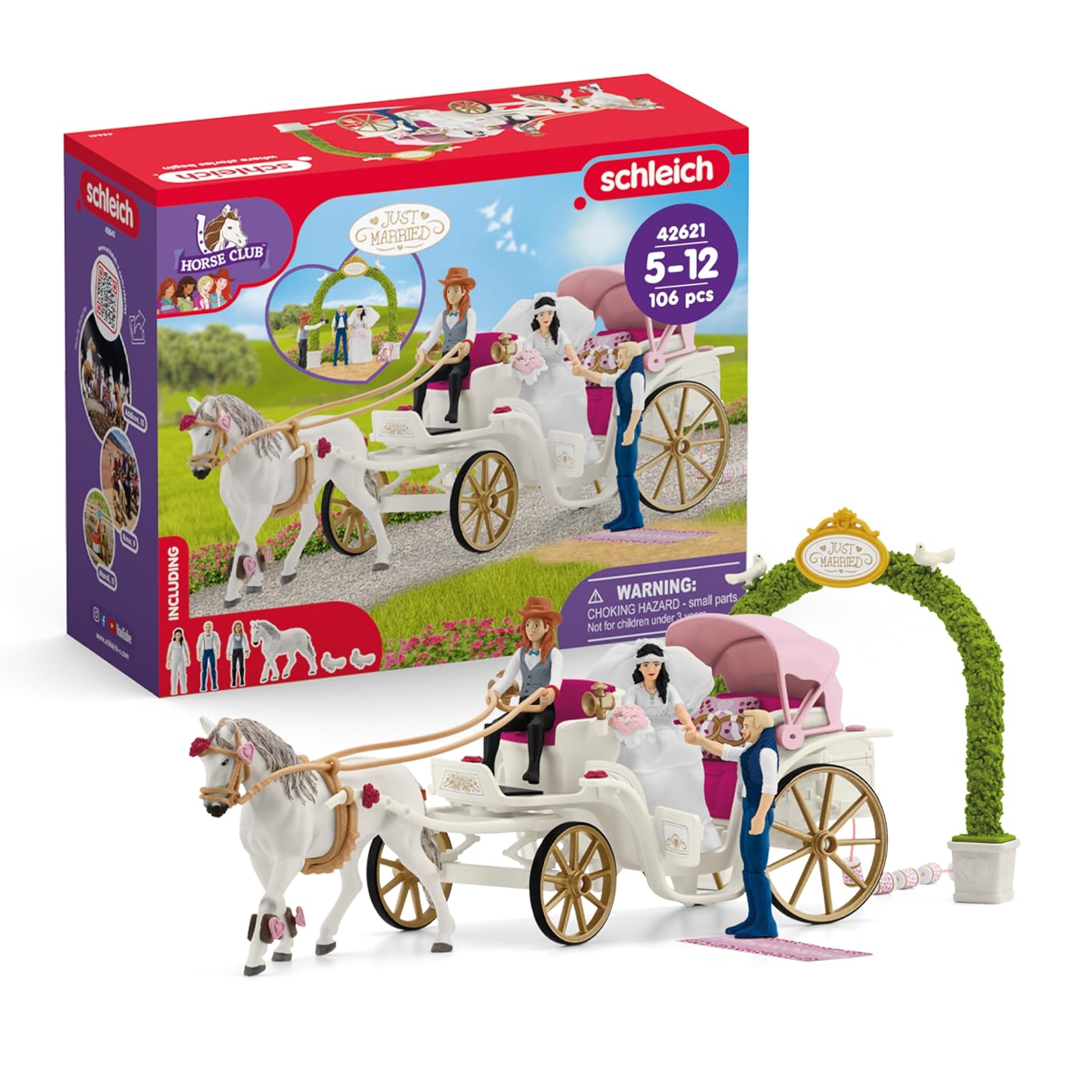 schleich HORSE CLUB | Calèche de mariage 42641 | Couple de mariés avec calèche, Hannah, cheval et accessoires | Superbe cadeau pour filles et garçons | Jouet pour enfants dès 5 ans | Set de 106 pièces