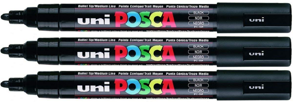 Uni Posca PC-5M Black Colour Paint Marker Pens 2.5mm Medium Bullet Tip Nib Writes On Any Surface Glass Metal Wood Plastic Fabric by uni-ball (pack of 3 )