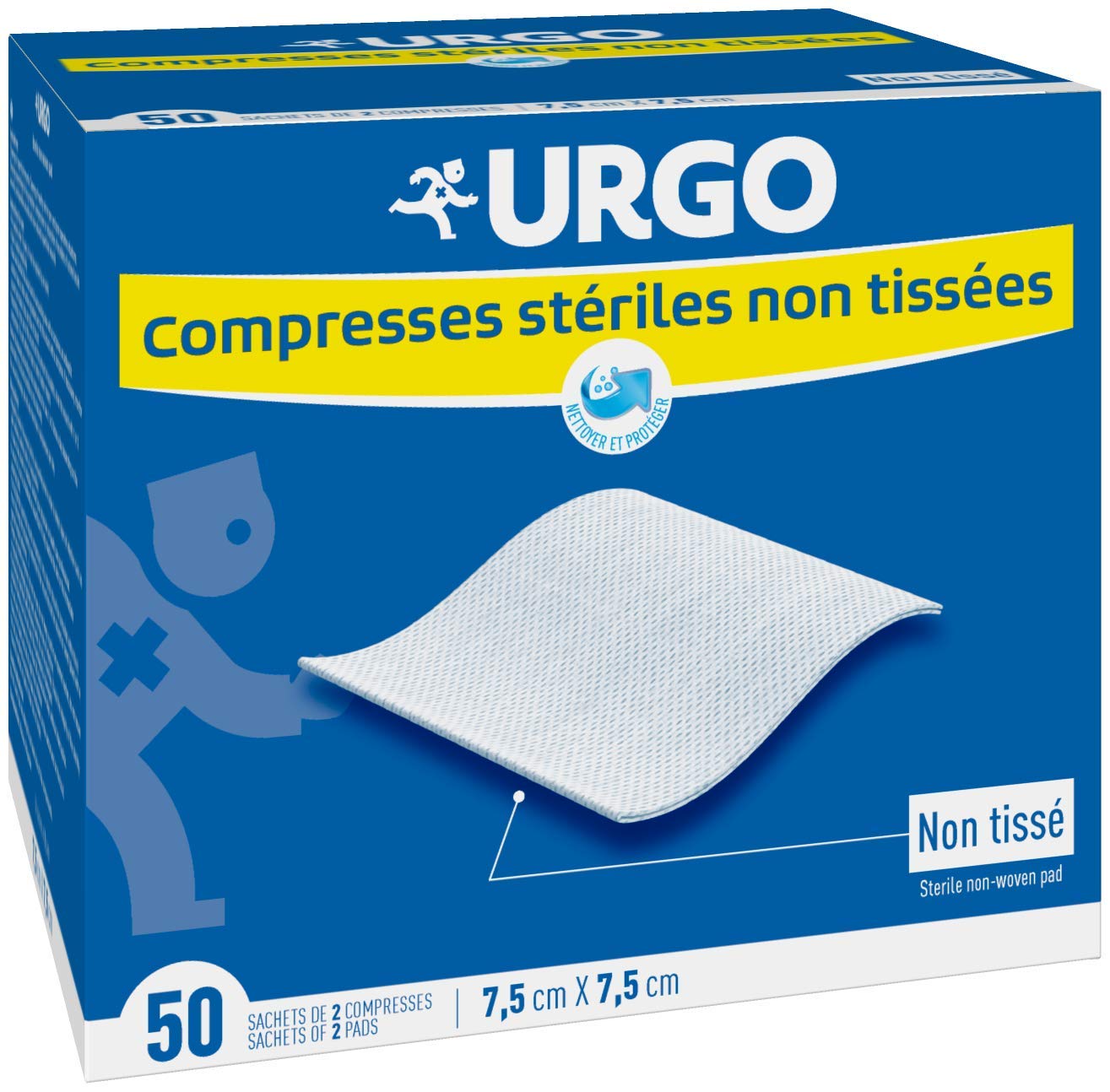 Urgo – Compresses stériles – Non tissées – Boîte de 50 sachets de 2 compresses – 7,5cm x 7,5cm
